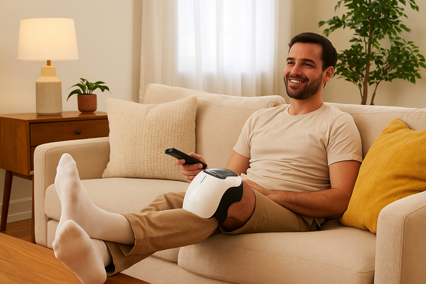 PhysioKnee lindert schmerzhafte Gelenksteifheit und chronische Knieschmerzen, indem es gezielte Wärme, sanfte Vibration und wohltuende Kompression kombiniert.