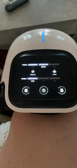 „3-in-1 Knie-Massager kombiniert Rotlicht, Wärmetherapie und Massagetherapie zur temporären Linderung von Gelenkschmerzen, Steifheit und Beschwerden.